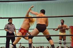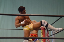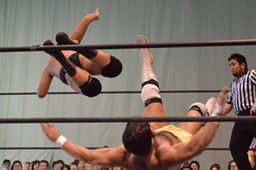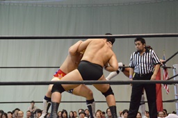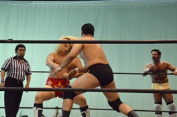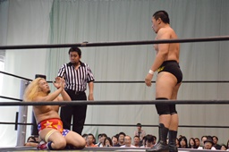 宮武エルボー、逆水平。福田ストンピング、ロープに振る、宮武切り返してフライングバックエルボー(左写真)、樋口にタッチ。