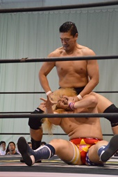 ボディスラムからボディプレス、カウント2。顔面ひねり(左写真)、福田ロープ。