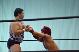 先発はアントンと高尾。ロックアップ、アントン腕を取る、高尾切り返す、アントン切り返す(右写真)。