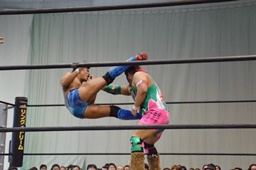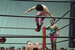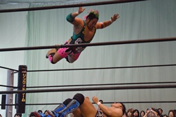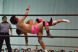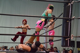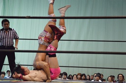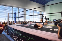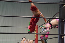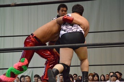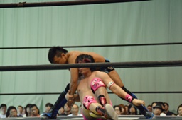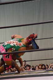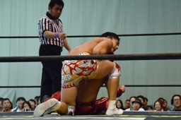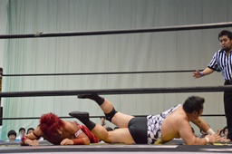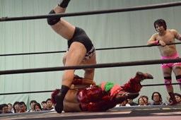 トペ狙って助走、何かにつまづいてまた転倒(右写真)。石井と高尾がエプロンに引っ張り出しサンドイッチドロップキック、高尾カバー、カウント1。入江にタッチ。5分経過。