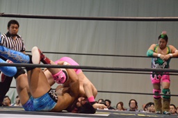 遠藤ロープに振ってケブラドーラ・コン・ヒーロ(右写真)、さらにシュミット流バックブリーカー。