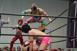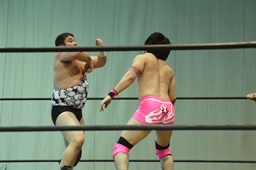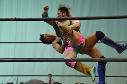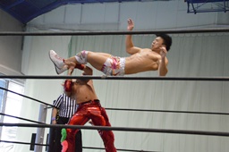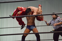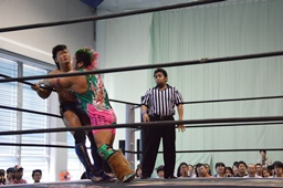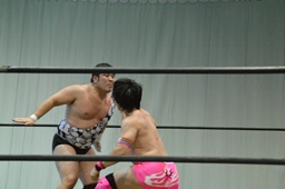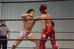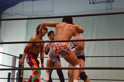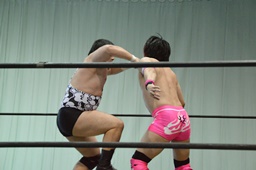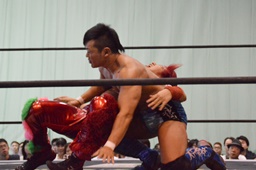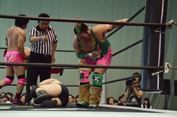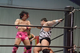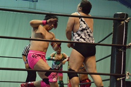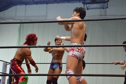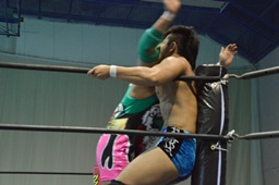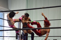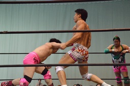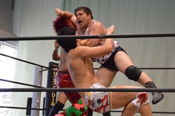 遠藤ブレーンバスター、高尾着地してバック取る、遠藤コーナーに下がってブレーク。遠藤コーナーの高尾に突っ込む、高尾かわしてドロップキック、石井がエプロンから延髄蹴り(左写真)。
