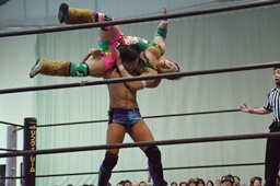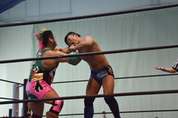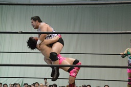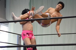 入江パワーボム狙う、遠藤はウラカンラナに切り返す(右写真)、カウント2。