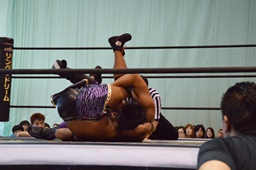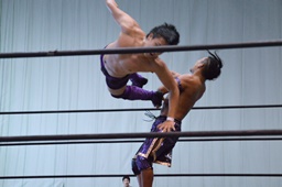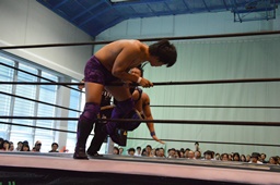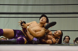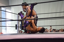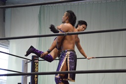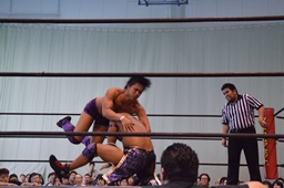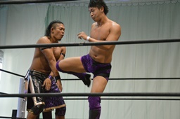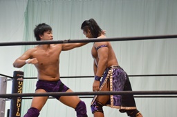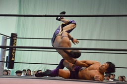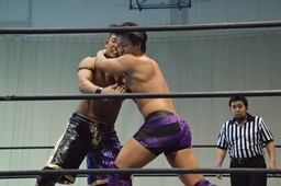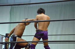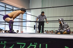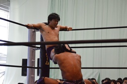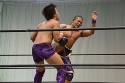 彰人上になる(左写真)。梅田起き上がってバック取る、彰人ヘッドロックからフライングメイヤー、梅田ヘッドシザーズ。