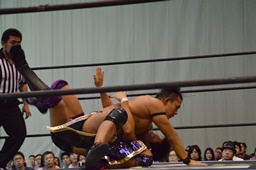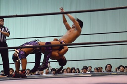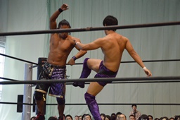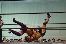梅田ロープに飛ぶ、彰人カウンターの低空ドロップキック(左写真)。
