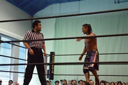 梅田が焦れて場外に追うと彰人はリングに戻る(右写真)。