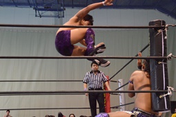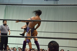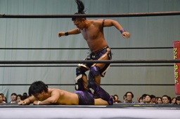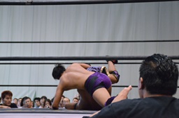 梅田ロープに振ってドロップキック、彰人スカす。彰人ヒザに蹴り、ロープに飛ぶ、梅田カウンターのドロップキック(右写真)。