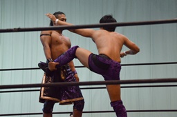ロープに飛び乗って反転ミドルキック(左写真)。
