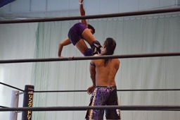 ロープに振ってヒップトス、吊り天井の形で両ヒザ裏を踏みつける(右写真)。