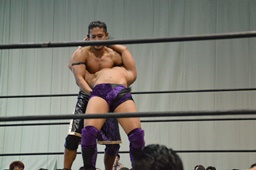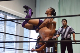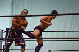 ロープワーク、梅田アームドラッグ連発(右写真)からミドルキック。
