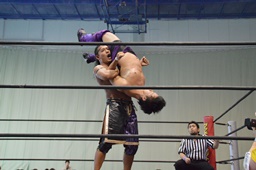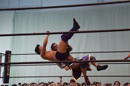 串刺しショルダータックルからダブルアームスープレックス(左写真)、カウント2。
