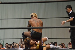 佐々木が入ってきた坂口に投げっ放しドラゴンスープレックス(右写真)。