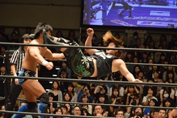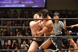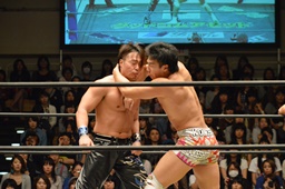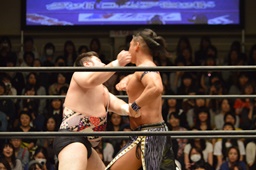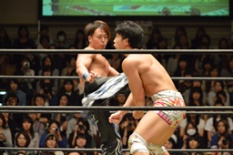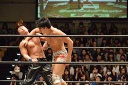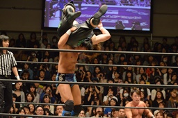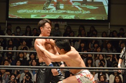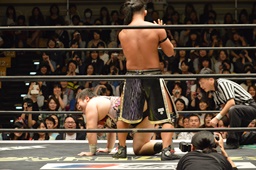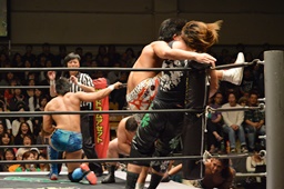 彰人とウラノが合体のフェースクラッシャー(左写真)、ウラノドロップキック、カウント2。