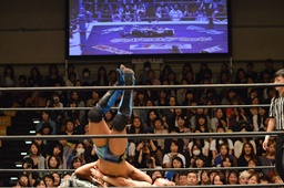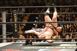 ロープに振ってテーズプレス(右写真)からフォアアームドロップ。