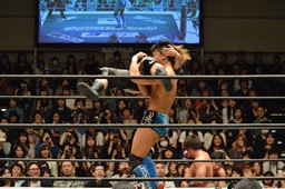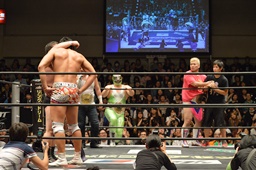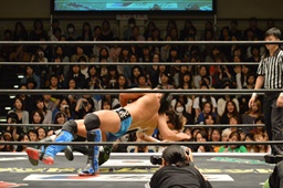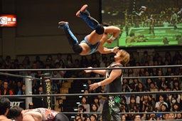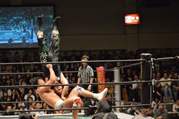 アントンコーナーに振って突っ込む、彰人カウンターの低空ドロップキックから俵返し(右写真)、ウラノにタッチ。