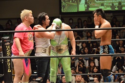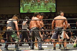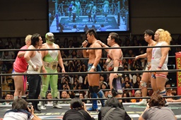 大家「お前たちがそんなに挑戦したいなら受けてやるよ!俺たち#大家帝国はプロレスをメジャースポーツにするために日々頑張っております。ベルトを防衛すること、それがプロレスをメジャースポーツにする第一歩だと思っております。いくぞー!」(右写真)