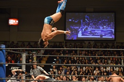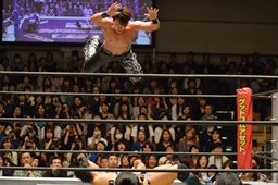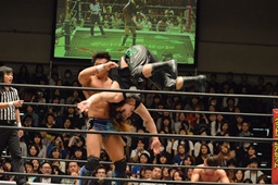 その場跳びムーンサルトプレス(左写真)、2人がカット。