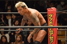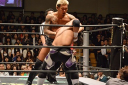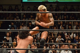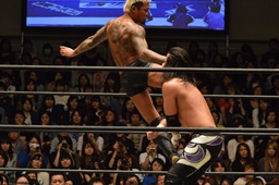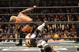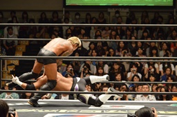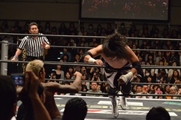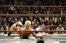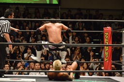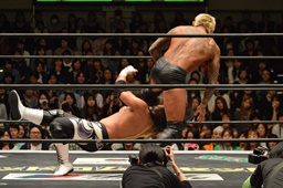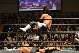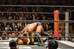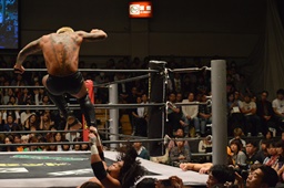 佐々木コーナーに上ってダイビングエルボードロップ、坂口かわす(左写真)。