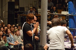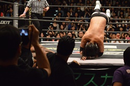 ジャンピングミドル(左写真)、佐々木場外転落。10分経過。