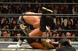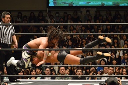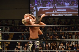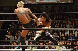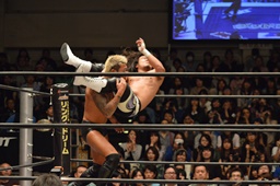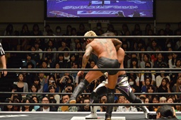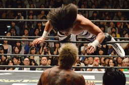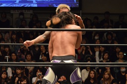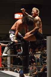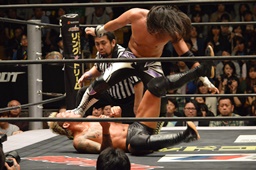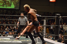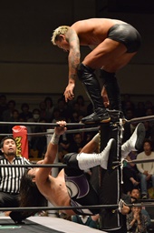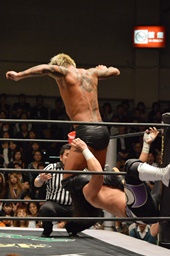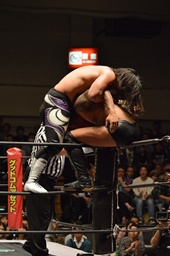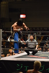 坂口飛びヒザ蹴り、カウント1。立ち上がった佐々木の背後から飛びヒザ蹴り(右写真)、
