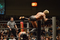 坂口を客席に座らせるとコーナーからダイビングエルボードロップ(右写真)。