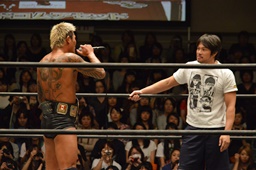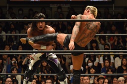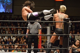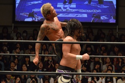 佐々木ベトナムドライバー狙う、坂口ブロックしてミドルキック(右写真)。坂口ロープに飛ぶ、佐々木カウンターのドロップキック。