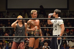 坂口「兄貴から譲ってもらったこのベルト、守りました。そしてすげえケガかもしんねえけど、俺らから言わせてもらえれば大したことないケガです。一日も早く酒呑の真ん中に戻ってきて。それまで俺、コイツ守っているんで、帰ってきた暁には勝負しましょう。よろしくお願いします。」(左写真)