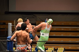 ロープに飛ぶ、遠藤カウンターのドロップキック(右写真)、竹下にタッチ。大家もササダンゴにタッチ。