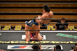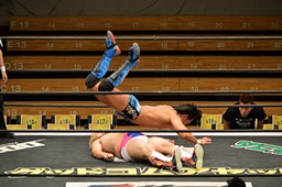 その場跳びムーンサルトプレス(右写真)、カウント2。
