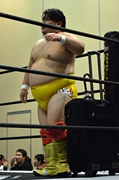 リング上でコスチュームを脱ぐアントン、汗を拭いてやる福田(右写真)。