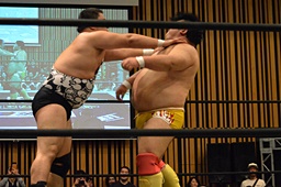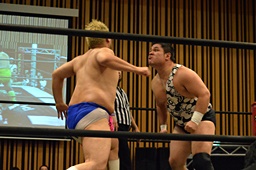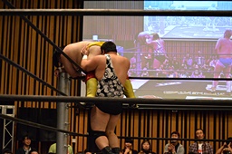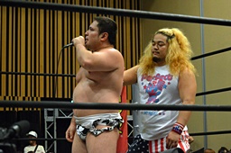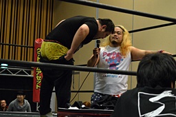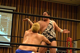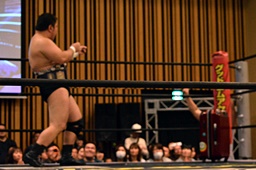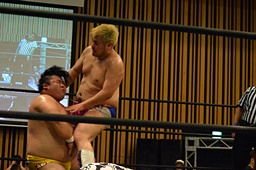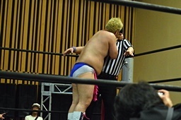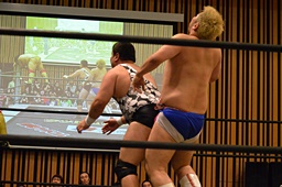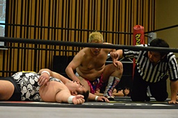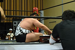 ディーノがボディスラムからニースタンプ、カウント2。ナイトメア、カウント2。伊橋をターンバックルに振る(右写真)。