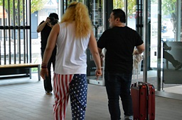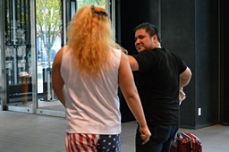 キャリーバッグを引いてリングを後にするアントン(左写真)。