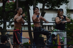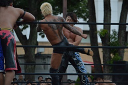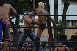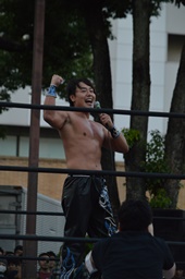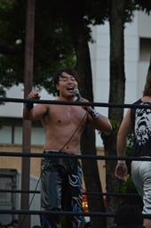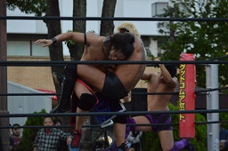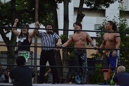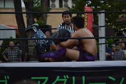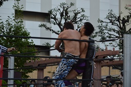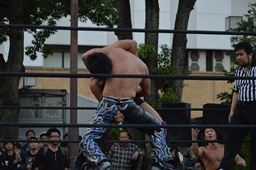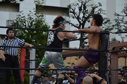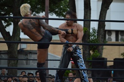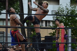 彰人はブレーンバスターに切り返す(右写真)。HARASHIMAにタッチ。