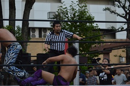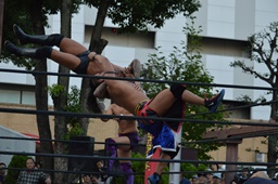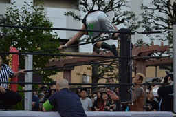 梅田ミドルキック、ロープに飛ぶ、HARASHIMAカウンターのジャンピングハイキック(左写真)。