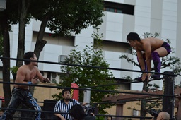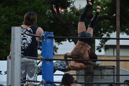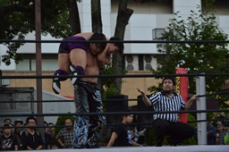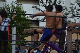 HARASHIMA坂口をコーナーに振って串刺しビッグブーツ、コーナーに上げて雪崩式ブレーンバスター(右写真)、カウント2。