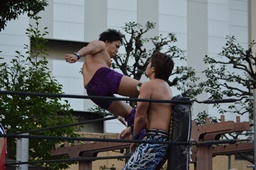 梅田コーナーに振って串刺しのミドルキック(右写真)、