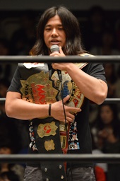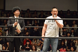 本編開始。高木社長と鶴見GMがリングに上がり、飯伏の欠場と、それによるKO-D無差別級戦他のカード変更を発表(右写真)。