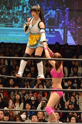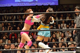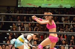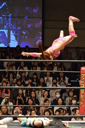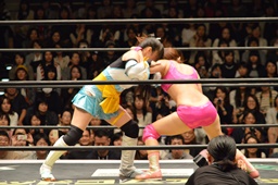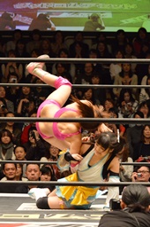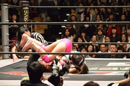 チェリーがロープに押し込む(右写真)、ロープに振る、清水はカウンターのフライングクロスチョップ。