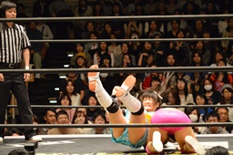 エビ固め(左写真)、カウント2。5分経過。