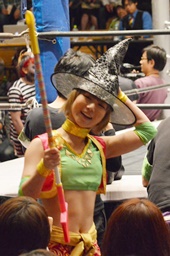 坂崎ユカがいつもよりデカい魔女の帽子かぶって入場(右写真)。
