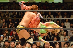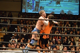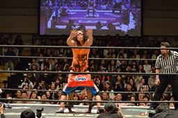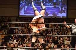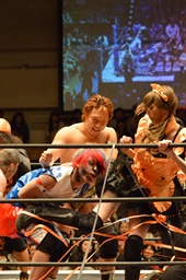 大石ブレーンバスター狙うが赤井が切り返す(右写真)、カウント2。ストンピング打ち込んで高梨にタッチ。