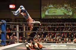 勝俣カニばさみでロープに突っ込ませると619、さらに大石が場外からドロップキック(左写真)。