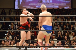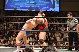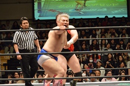ディーノ首投げから男色ベアハッグ(左写真)、リリースしてストンピング。