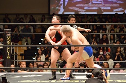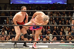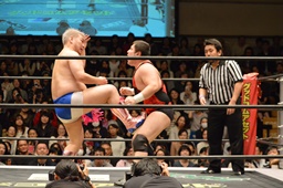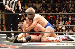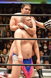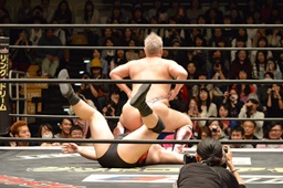 ディーノアントンの股間をつかんで形勢逆転(左写真)。