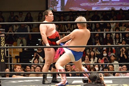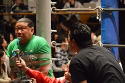 えずく大鷲に新藤リングアナがギブアップか尋ねる(左写真)、