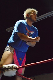 石井ドロップキック、2人かわす。ディーノキス(左写真)、