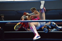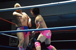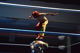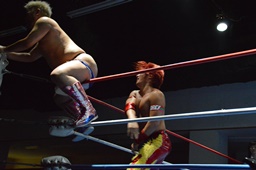 高尾大石をコーナーに振る、大石切り返して突っ込む、高尾カウンターのキック、コーナーに上って大石の背中にダイビングフットスタンプ(左写真)。
