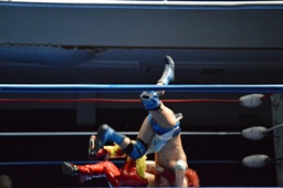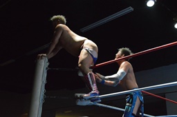 ディーノロープに飛ぶ、高尾ドロップキック、ディーノロープにつかまってスカす。ディーノロープに飛ぶ、高尾前転からドロップキック(左写真)、石井にタッチ。