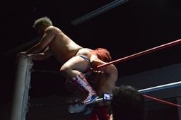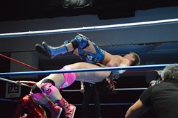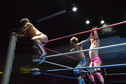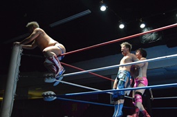 高尾エルボー、ロープに飛ぶ、ディーノが入って3D(左写真)、高尾2で返す。