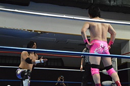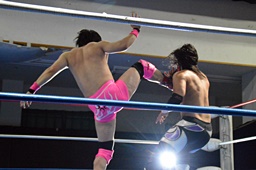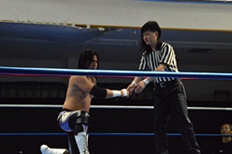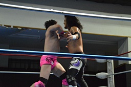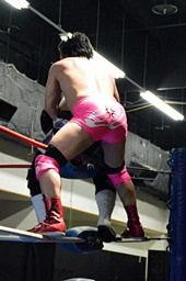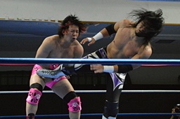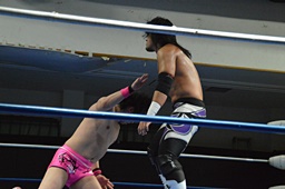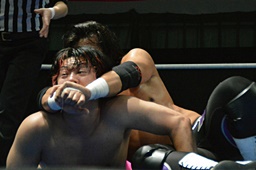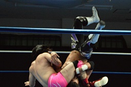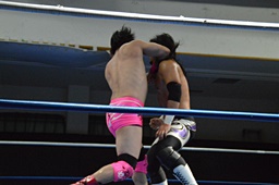 佐々木コーナーに振って突っ込む、石井ジャンプしてかわすとバック取って投げっ放しジャーマン(右写真)。